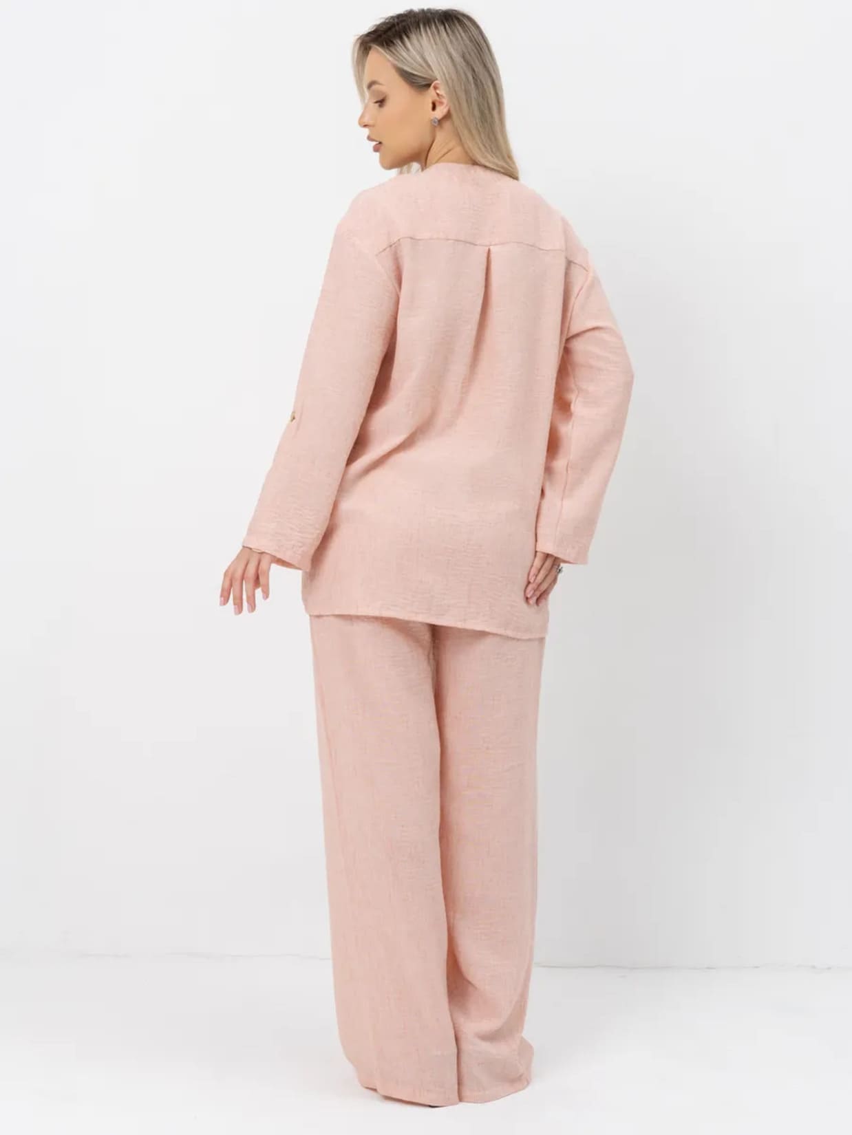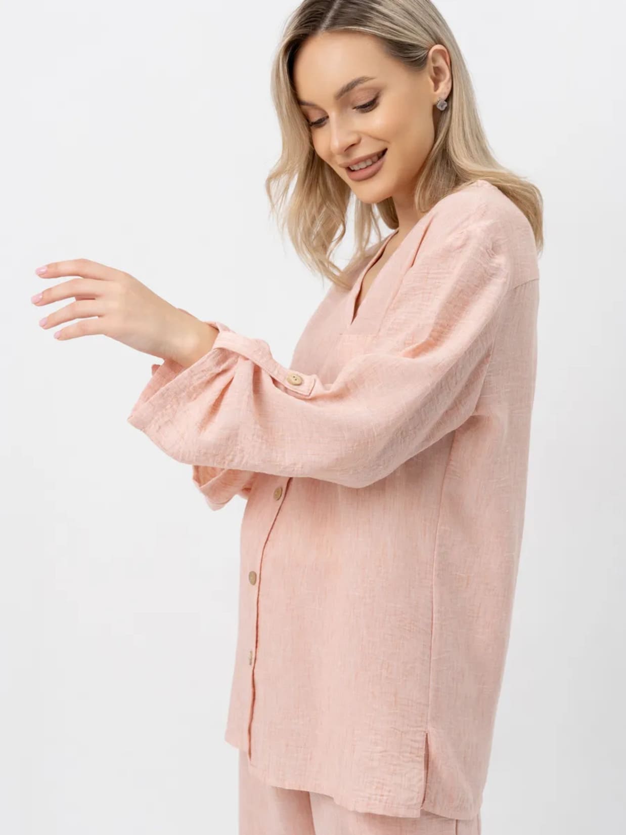 В набор входит верх с длинными рукавами и пуговицами для кормления, а также удобные брюки со скрытой регулировкой талии.