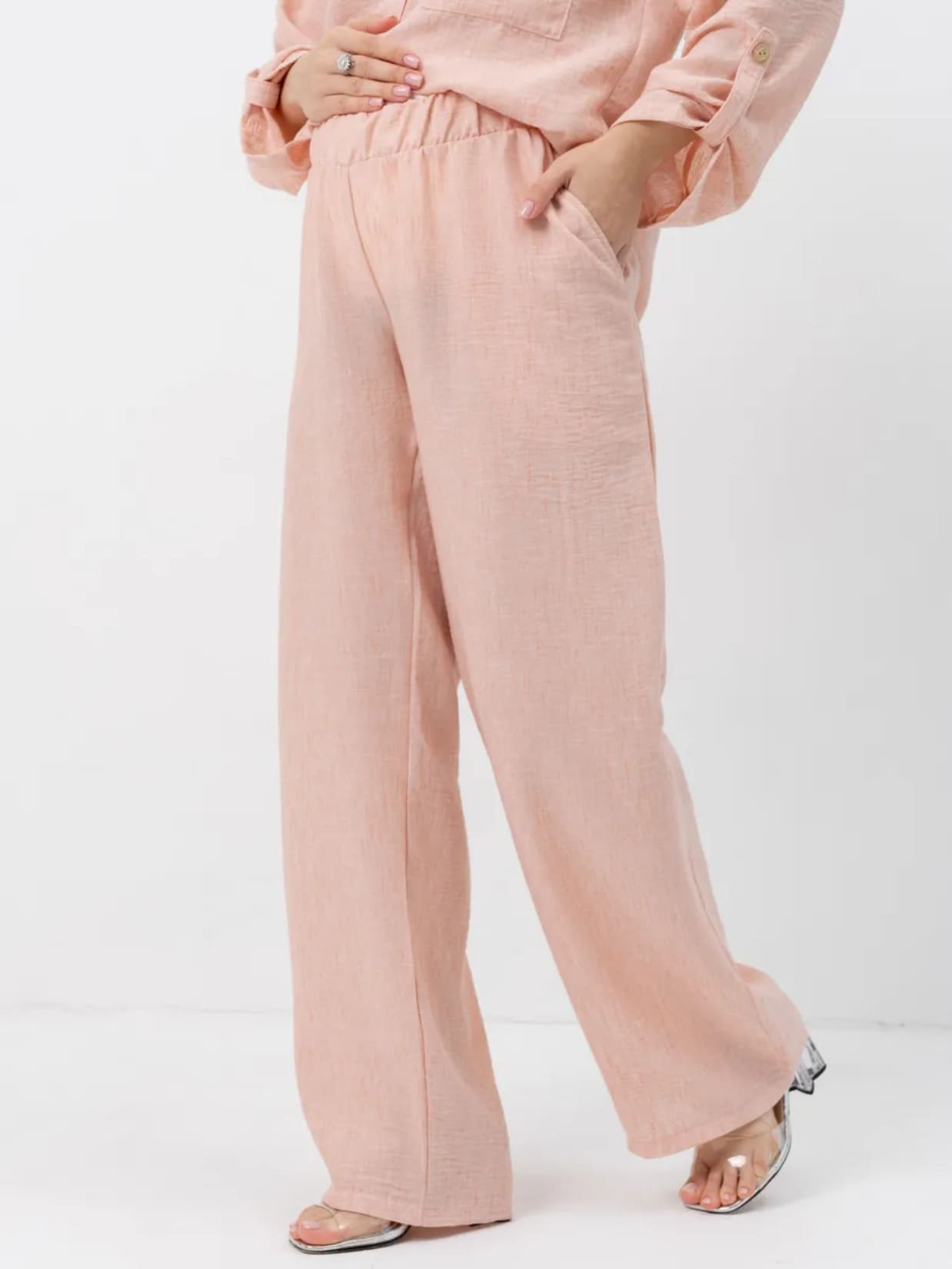 Брюки идеально сочетаются с рубашкой, предоставляя свободу движений. Эластичный пояс комфортно облегает живот, не создавая дискомфорта.